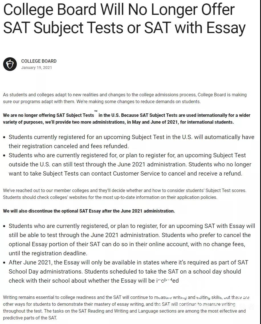 2021年的6月将是学生最后一次可以参加的SAT Essay (SAT作文考试),之后SAT Essay (SAT作文考试)将不再举行。已报名5月或6月SAT Essay (SAT作文考试)的学生可以联系SAT客服取消考试,并得到全额退款。