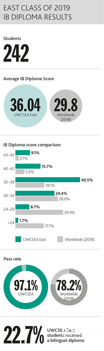 UWCSEA东部淡滨尼校区最新IB平均分36.04分(全球平均分29.8分),97.1%的学生顺利毕业,9.1%的学生获得43分以上: