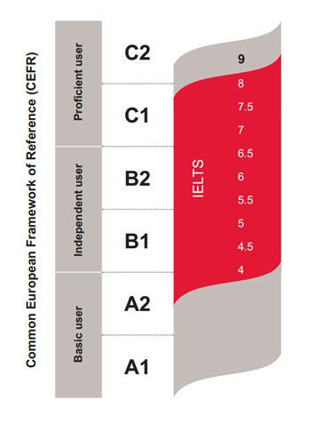 从下图可以看出雅思考试分数与CEFR各个能力等级的对应程度: