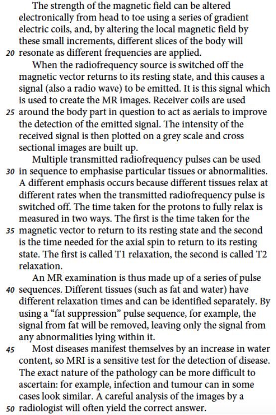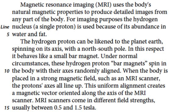 这篇文章真题结构比较明显,其中第一段为介绍话题(introduction)。第二到第六段明显在语言上非常专业,都是物理学的知识,这个部分也解释了howdoes MRI work? 所以是原理段。第七段说MRI是sensitive test,所以是应用段(application/practical use),最后一段讲MRI对人体没有伤害,讲的是它的好处(advantage)。