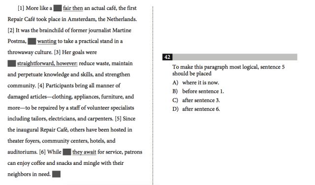 但是接下来,通过观察和理解,我们发现第4和6两句话都转变到了一般现在时,而不是之前的过去时。这两句话都是在描述Repair Café运营的日常,而不再是第一间Repair Café的开业。根据一致性原则,这两句话应该放在一起。所以我们必需重新思考第5句的位置。