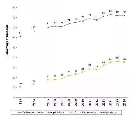 来自一年级学生的申请数量比去年增加了7%,转学生申请增加了1%,而国际学生申请平均增加了13%。随着大学通过各种渠道加大招生力度,以及通过Common和Coalition系统进行申请的学生数量越发增多,这种增长趋势目前没有减弱的迹象。尽管美国高中生总体人数趋于稳定,但由于学生平均申请的大学数量增多,以及美国高校对国际申请人的重视。所有这些因素只会造成一个结果—— 美国大学的申请人将会继续暴增。