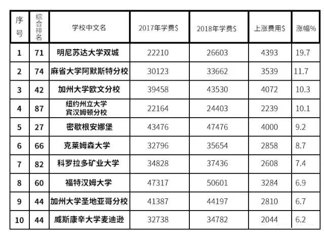 美国TOP10学费涨幅百分比