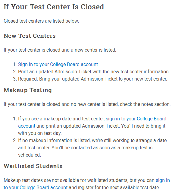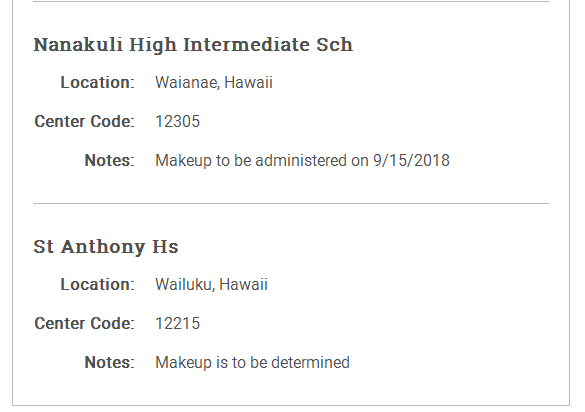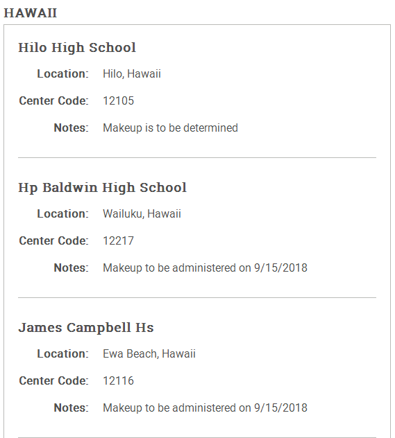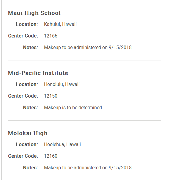 人算不如天算,夏威夷的飓风导致整个夏威夷州的考场全部取消,影响到了很多SAT考生的备考计划。马里兰州的Northwest Hs也取消了8月的SAT考试。这些考场有些改为9/15再进行补考,有些则也没有说明补考时间。