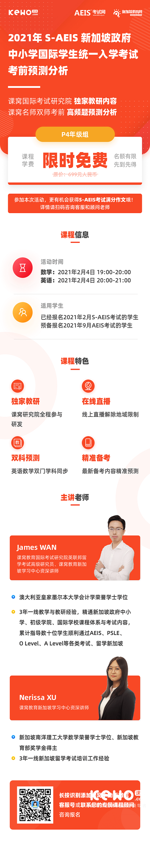 AEIS考试主要针对小学 2 -5 年级和初中 1 -3 年级适龄的、在新加坡没有学籍的国际学生,考试时间为每年 9 月或 10 月,入学时间为次年 1 月,S-AEIS考试时间为次年2 月或 3 月,公布成绩的时间则为次年4月,包括了英语和数学的统一测试,学生们均于5月安排入学。