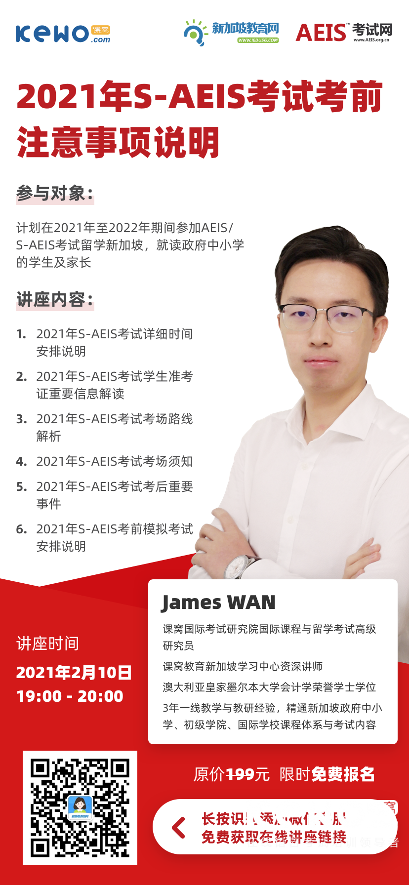 2021年S-AEIS考试将于今年2月23日、24日与25日举行!考虑到新冠肺炎疫情的影响,海外考生在申请前应确保考生符合SafeTravel Pass等相关规定顺利入境新加坡!