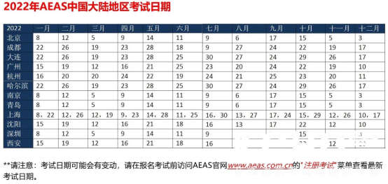 从考点及考试日期安排来看,只有上海考试场次安排为1个月2次考试,其他城市的考试场次安排仅为1个月1次,时间选择上有所限制,建议学生和家长尽量提前一年准备AEAS考试,以便尽早递出学校申请占位。